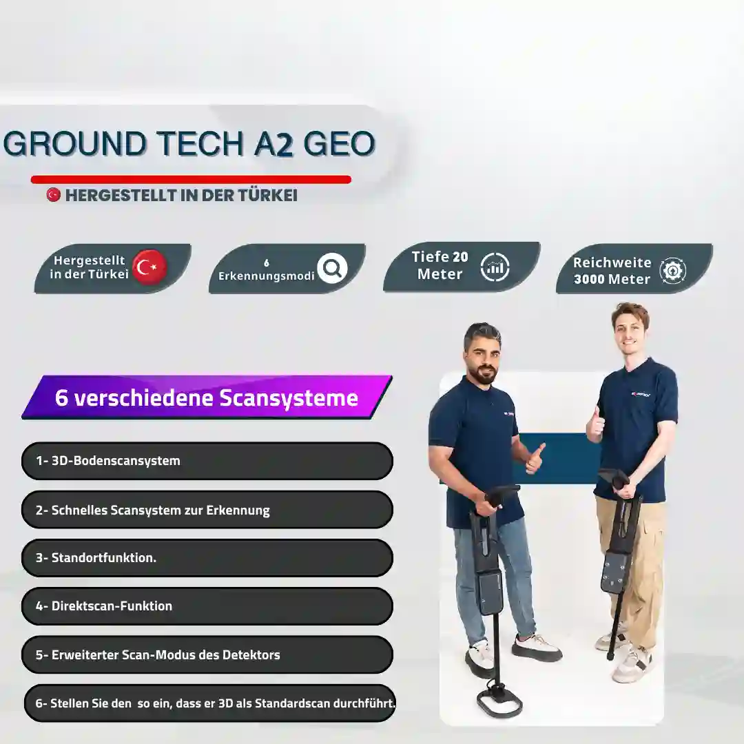Das Modell A2 ist ein fortschrittlicher Bodenscandetektor, mit dem Sie unterirdische Anomalien erkennen und 3D-Analysen durchführen können. Das Modell A2 wurde als praktischer und vielseitiger Metalldetektor und 3D-Bodenscangerät konzipiert und bietet integrierte, multifunktionale Lösungen für professionelle Schatzsucher, archäologische Entdecker und die Erkennung unterirdischer Strukturen. Das Gerät ist mit sechs verschiedenen Scanmodi ausgestattet.