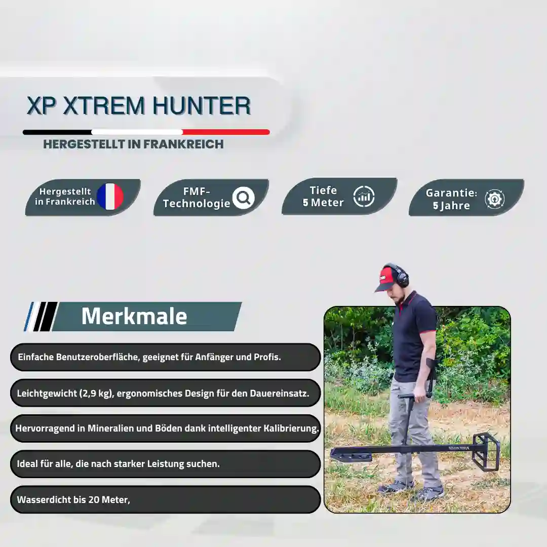 Der Xtrem Hunter-Detektor kann extreme Tiefen von bis zu 5 Metern (16 Fuß) erreichen und die tiefsten Ziele aufdecken.
